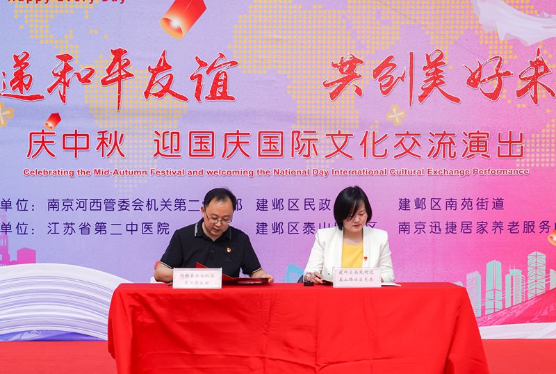 活动现场,在双方领导、党员和社区居民群众的共同见证下,管委会机关第二党支部书记郭文权和建邺区南苑街道泰山路社区党委书记陈健华签订了结对共建协议。