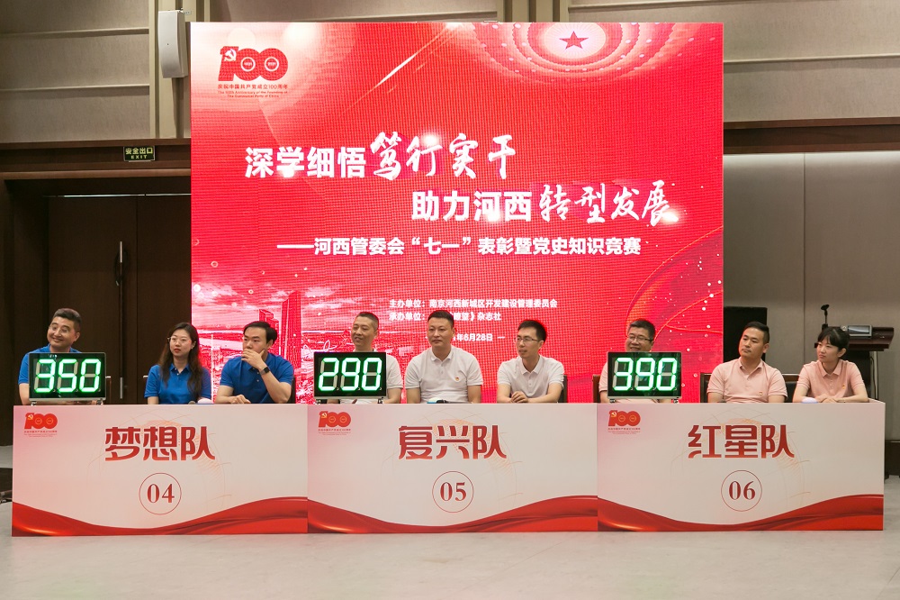 一百年的风雨兼程,铸就了华夏儿女不屈的脊梁,一百年的上下求索,迎来了中华民族复兴的曙光。在中国共产党成立100周年之际,在“两个一百年”奋斗目标历史交汇的关键节点,为回顾和总结我党百年来的奋斗历程,激发全体干部职工干事创业的热情,为高标准加快建设现代化国际性城市中心,聚焦东部地区重要金融中心建设注入新的强大动力,6月28日,河西管委会举办了以“深学细悟笃行实干 助力河西转型发展”为主题的“七一”表彰暨党史知识竞赛。