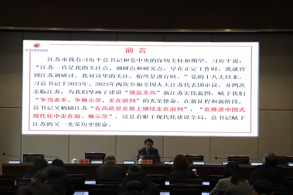 学习贯彻习近平总书记对江苏工作的重要讲话和指示精神是当前和今后一个时期全省上下的一项重大政治任务。本次党员培训的第二课,邀请到江苏省委党校彭飞教授,以“学习贯彻习近平总书记对江苏工作的重要讲话和指示精神”为主题,紧密围绕总书记赋予江苏的新使命、在科技创新上取得新突破、在强链补链延链上展现新作为、在建设中华民族现代文明上探索新经验、在推进社会治理现代化上实现新提升五个方面,和“四个新”的重大任务,为全体党员干部职工做了系统解读,主题鲜明、内涵丰富,既深入浅出,又通俗易懂,对完整、准确、全面学习贯彻习近平总书记对江苏工作重要讲话精神提供了重要启发和帮助。