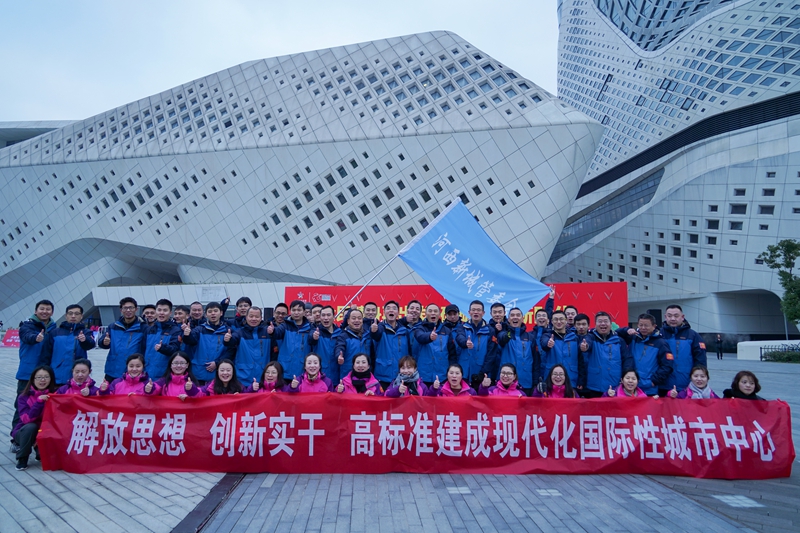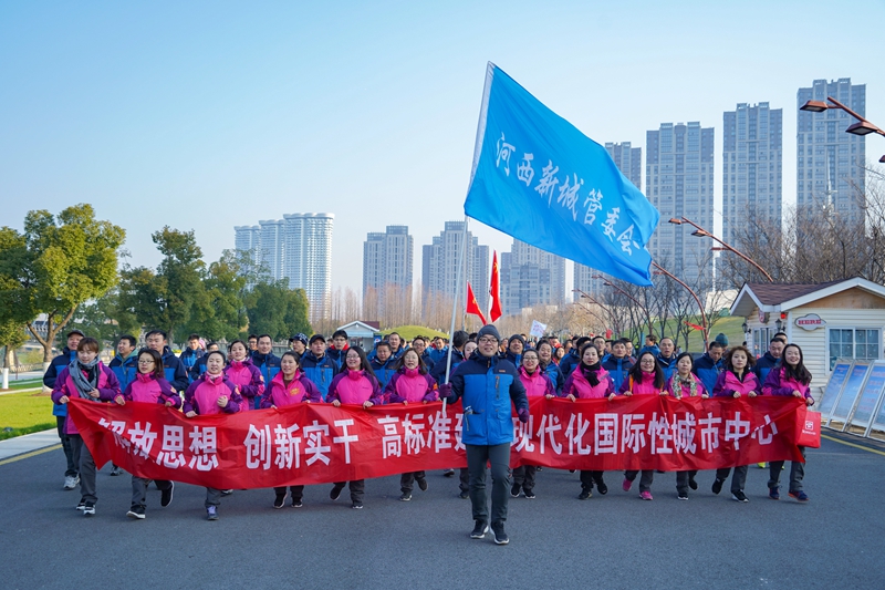 简短的热身活动和起跑仪式后,河西管委会方阵以整齐的队形,迈着坚实的步伐,从青奥村广场出发,途经南京奥林匹克博物馆、“南京眼”步行桥,抵达终点——南京青奥体育实验室。途中,管委会的干部职工们精神饱满、朝气十足,拉起“解放思想创新实干 高标准加快建成现代化国际性城市中心”的横幅标语,高呼“创新实干,河西新城再出发”的口号,尽情抒发着对新一年的美好期待,表达出共建健康南京、助力河西现代化国际性城市中心建设的良好心愿,《南京日报》、《扬子晚报》等我市主要媒体在对长跑活动的报道中都配发了管委会方阵的照片,展现了管委会干部职工团结昂扬饱满的精神风貌。