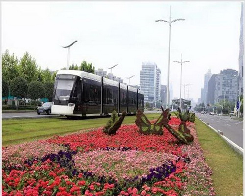 蝴蝶在绿地中翩跹起舞,优美的身姿轻盈灵动,让人感到回归自然的雀跃幸福。美丽的花纹,眩目的色彩,令人赏心悦目。与有轨电车一起,仿佛带领人们通往幸福的未来。