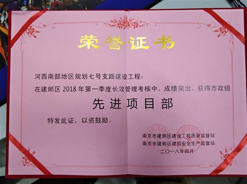 规划七号支路道路工程获得建邺区市政组“先进项目部”称号