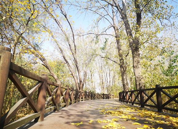 绿博园的栾树、法桐、枫香、水杉、银杏;青年文化公园的乌桕、杨树;鱼嘴湿地公园的意杨、垂柳;滨河公园的无患子、朴树,生态公园湖水掩映着参差的色彩;各色彩叶,缤纷绚烂,美不胜收。