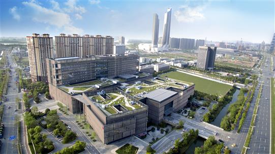 该工程全寿命周期贯穿绿色理念,获国家住建部绿色三星建筑认证,建筑节能达65%。其中,幕墙陶土板装饰条巧妙利用建筑布局,夏季遮挡阳光,冬季充分接受阳光;太阳能热水系统、屋面导光管采光系统、种植屋面等绿色技术的运用,实现了零污染、低能耗、节能环保;雨水回用、中水系统的运用,可直接节约用水;药品气动物流系统、取药处药品自动发放系统,实现了从库房到病房、库房到病人手中的智能、高效传输。