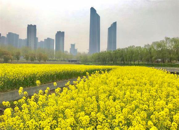 油菜花姿容清丽,盛放在最具现代气息的青年文化公园,田园与城市相映成趣。
