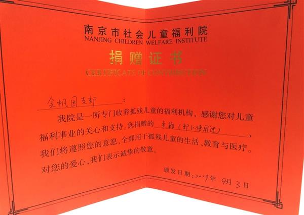 此次活动在金帆团支部积极倡议发起下,得到了全体团员及公司员工的大力支持。2019年3月19日,在国际青年会议酒店举行了“以爱送温暖,让幸福绽放”爱心捐书仪式,各部门代表参加了捐书仪式,共为南京社会儿童福利院捐赠图书400余本。4月3日,金帆公司党支部、团支部部分代表和志愿者们,带着沉甸甸的两大箱图书前往南京社会儿童福利院。