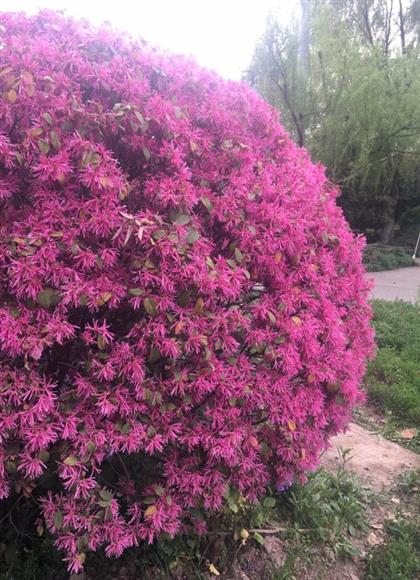 滨江公园内同样缤纷热烈的红色花系还有花开成瀑、团团簇簇的红花檵木;垂在枝头的紫藤花与回廊檐顶融合得浑然一体,显得芬芳雅致;还有那紫艳艳、一簇簇的石竹花,与杜鹃花一同点燃春天的色彩。