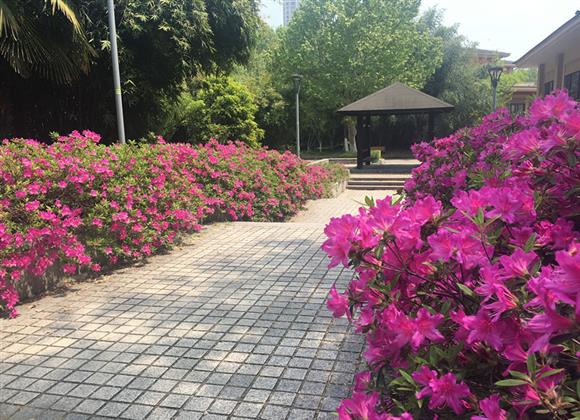 杜鹃亦花亦鸟,你中有我,我中有你,不分彼此。与鸟同名的杜鹃花播撒在滨江公园的各处景点,花坛边,建筑旁,路尽头,烂漫于园区的每一处,播散芳华、彰显热烈。
