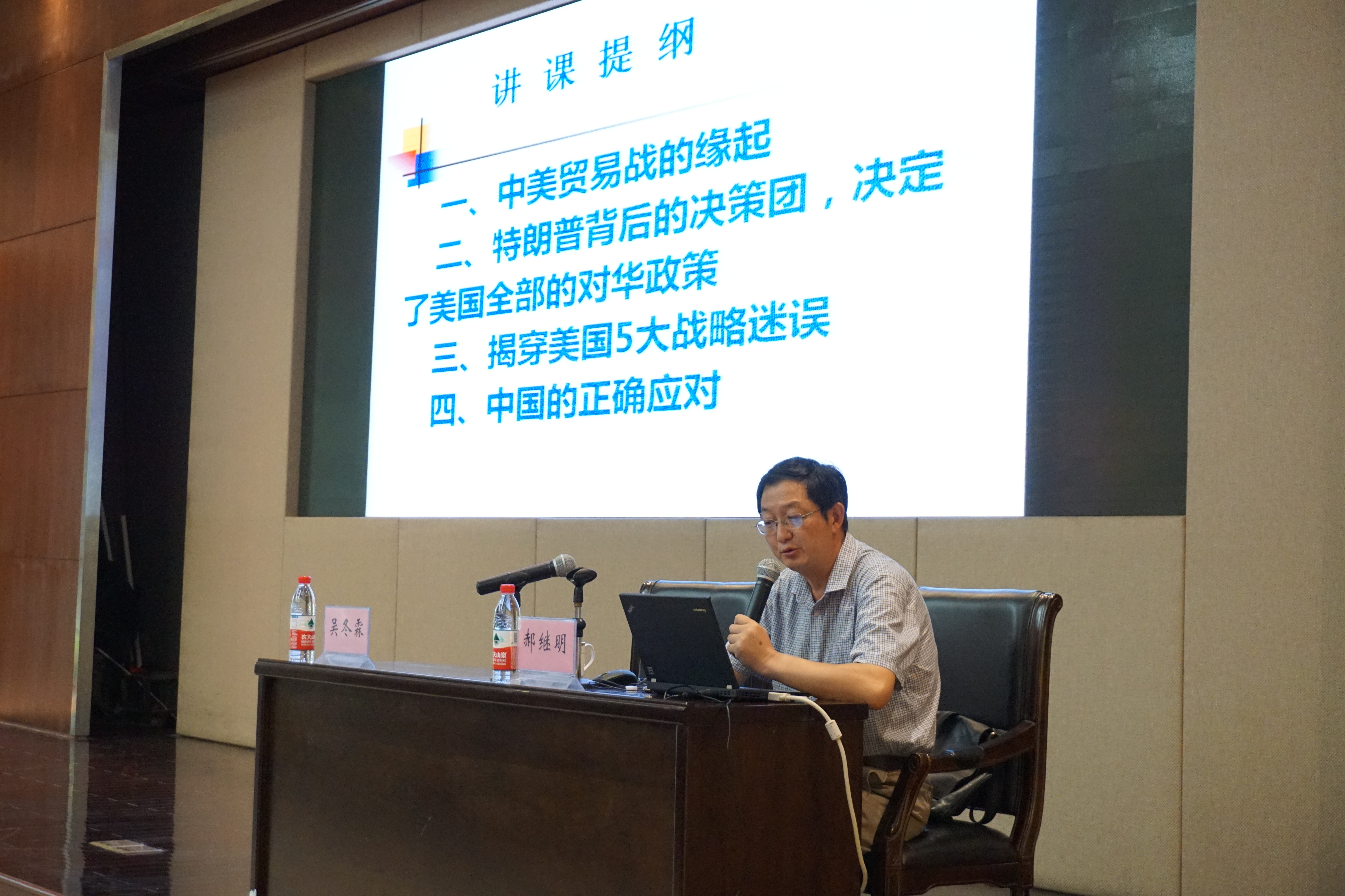 7月9日,河西管委会“河西讲堂”第三期“中美贸易争端的本质及中国的正确应对”专题讲座在管委会115会议厅成功举办。本场讲座邀请到南京市委党校教授郝继明主讲,管委会党组成员吴冬霖主持,管委会领导、机关全体干部、各公司中层以上干部共计240余人聆听了讲座。