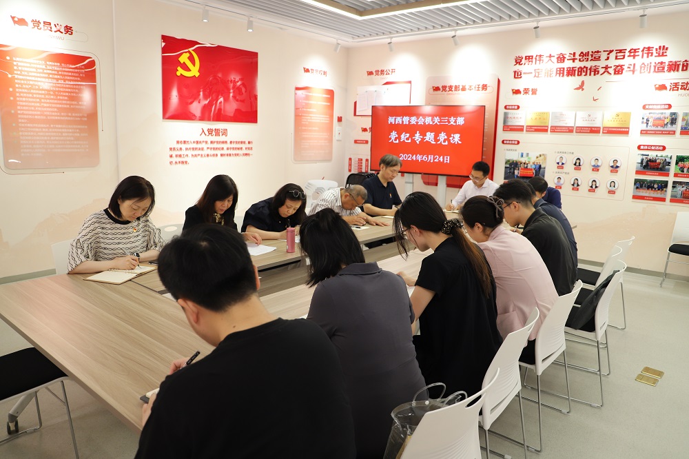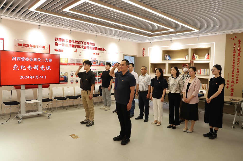 根据党纪学习教育工作安排,为深入贯彻落实全面从严治党,进一步推动党纪学习教育入脑入心、见行见效,6月24日,机关三支部在河西管委会党员活动中心开展党纪学习教育专题党课。河西管委会党组成员、副主任、机关党委书记陈洁同志和支部书记宁忠红同志分别授课。