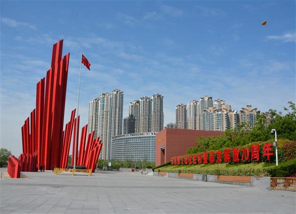 渡江胜利广场上矗立着大型群雕"千帆竞渡"。到了夜晚,49根大型红色立柱在江边闪耀,犹如灯塔一般指引着革命者奋勇向前,又似连天烽火,让人们追忆起70年前那段峥嵘岁月,追忆起百万雄师过大江的雄风与豪情。