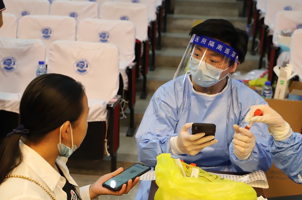 除了参与引导志愿服务的党员,还有4名党员抽调去协助医生进行核酸检测。穿上厚实的防护服、带上护目镜和口罩,就连一同前往的同志们也只能艰难分辨,党徽,就是他们的标记。